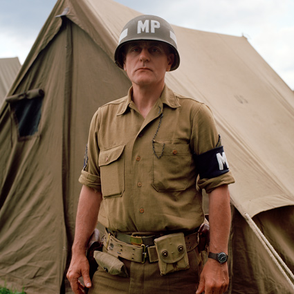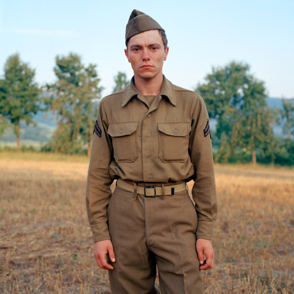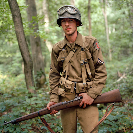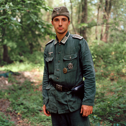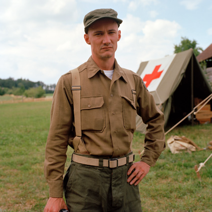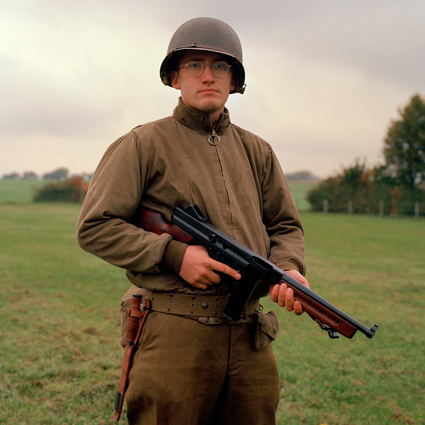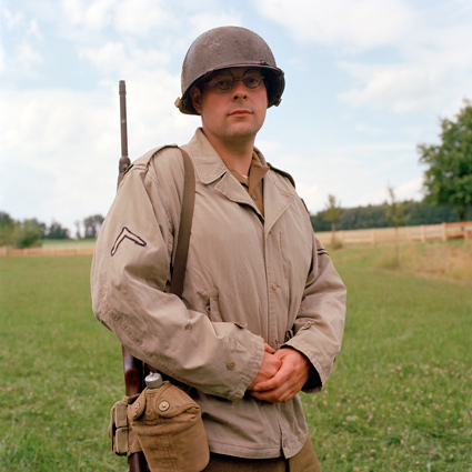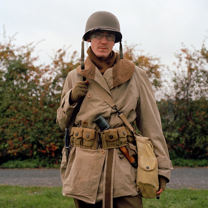 Daun löst einzelne Teilnehmer aus dem fiktiven Kriegsgeschehen und porträtiert sie. Der Bildausschnitt ist stets gleich, der Hintergrund bleibt diffus. Die Porträtierten blicken direkt in die Kamera. Für das Reenactment nehmen sie einen fiktiven Namen und einen militärischen Rang an, sie schlüpfen in eine Rolle. Man könnte meinen, sie würden in einer hierarchischen soldatischen Gemeinschaft aufgehen. Obwohl uniformiert, behelmt und bewaffnet, wirken die Männer dennoch wenig heroisch. Schon eher verkleidet. Aus ihren Gesichtern spricht alltägliche Individualität. So leben Dauns Fotografien vom Schwebezustand zwischen heroischer Fiktion und bürgerlicher Realität. Die Reenactment-Kultur blüht vor allem in Belgien, Frankreich und den Niederlanden. Denn aus alliierter Sicht ist das Militärische und das Heroische nicht diskreditiert. Urs Tilman Dauns Fotografien beschränken sich nicht auf die Abbildung einer Subkultur. Vielmehr lassen sie Parallelen zur Gegenwart erkennen. Auch wenn die Hobbysoldaten den Krieg bloß spielen, klopfen sie beständig an der Tür zur Wirklichkeit. Man liest immer wieder von jungen Männern, die von Westeuropa aus nach Syrien fliegen, um dort in den Krieg zu ziehen. Was sagt das über unsere Gesellschaft aus? Warum bekommen wir nicht genug vom Krieg, ob echt und 'nur' gespielt? TEXT: Eugen El |