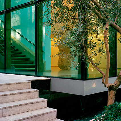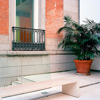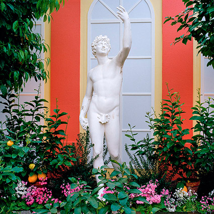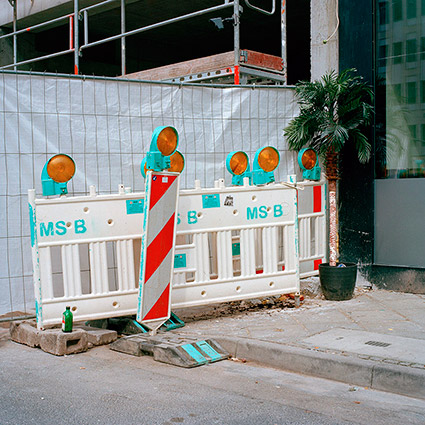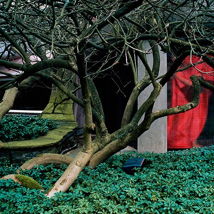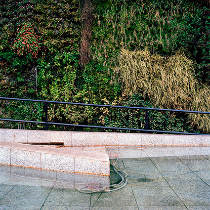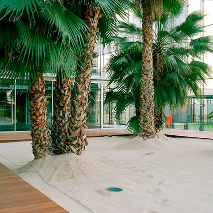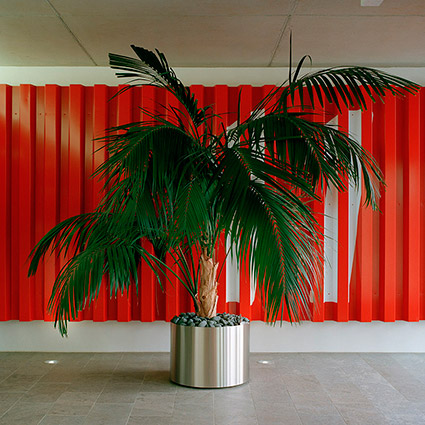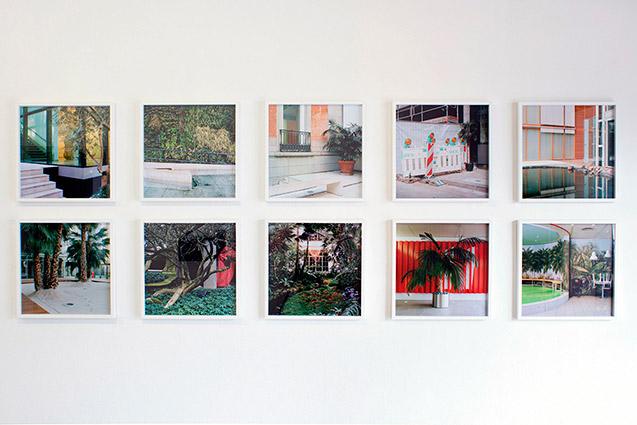 DAUN HAS AN EYE FOR THINGS THAT HAVE BEEN WRENCHED FROM THEIR NATURAL SURROUNDINGS AND TRANSPLANTED INTO A NEW SETTING. HE SEEKS OUT PUBLIC SPACES IN WHICH THE ANONYMOUS ATMOSPHERE HAS BEEN CORRECTED BY ADDING ARTIFICIAL GREENERY, PLACING THE EMPHASIS ON THESE ENVIRONMENTS USUALLY REGARDED TO BE OF SECONDARY IMPORTANCE. THE GREEN CORRECTIONS – PALM TREES, COLOURFUL PARADISIACAL FLOWERS AND EXOTIC PLANTS – CAN BE INSTANTLY MADE OUT AS SUCH AGAINST THE BACKDROP OF THE AUSTERE SPACES THEY OCCUPY. YET IN DAUN’S PHOTOGRAPHS, THE PLANTS INTRODUCED TO THESE SETTINGS ARE IN NO WAY MERE DECORATION. INSTEAD, THROUGH BEING CUT BACK, DISTORTED, PLACED IN FLOWER POTS OR SAND, THEY TURN INTO THE PROTAGONISTS OF ABSURD SCENES.