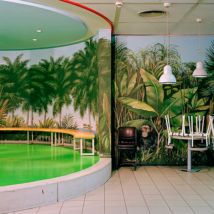 PLANTS ON PAPER WIND THEIR WAY UP THE WALLS WHILE THE BLUE OF A PAINTED SEA SHIMMERS SOFTLY IN THE BACKGROUND. THE ARTIFICIALITY OF THE WALLPAPER JUNGLE IS THE FIRST THING THAT CATCHES THE EYE IN URS TILMAN DAUN’S PHOTOGRAPH KASSEL FROM THE SERIES VERFÄLSCHT (FALSIFIED). THE GREY TILED FLOOR AND CEILING FRAME THIS VISUAL ILLUSION IN AN ABSURD WAY. THE CHAIR NEXT TO THE CHIMPANZEE IS FREE: MAYBE HE IS JUST WAITING TO FINALLY BE ABLE TO TAKE A SEAT AND OBSERVE THE HUMANS IN THE GLASS DOME THEY HAVE BUILT?